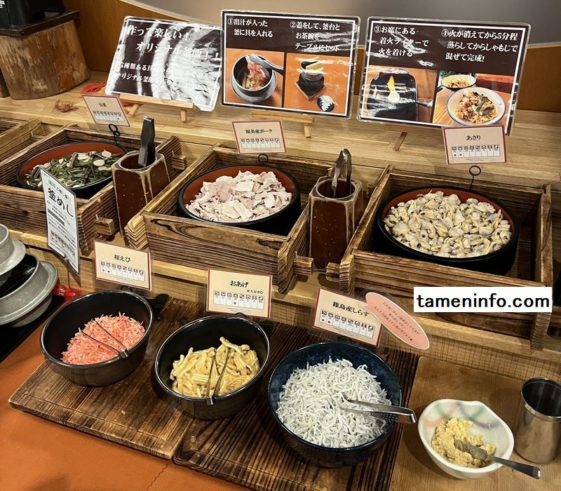 「釜飯コーナー」では、あさりやしらす、桜えび、油揚げ、山菜、などの具材を自分で選んでオリジナル釜飯を作れるんです。