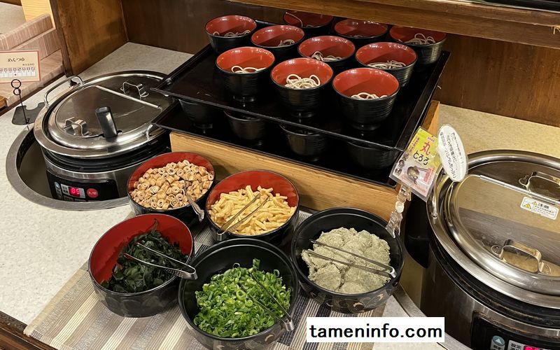 そして、お蕎麦コーナーにはトッピングが豊富に揃っていて、ねぎ、お揚げ、わかめ、とろろなど自由自在にカスタマイズできるのも楽しいポイントでした。