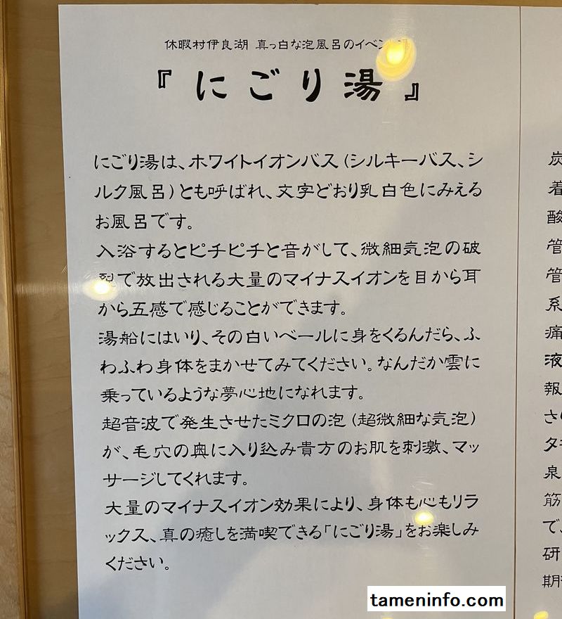 「にごり湯」は、ホワイトイオンバスと呼ばれる超微細な泡が特徴の白濁風呂で、まるで雲の中に包まれているような感覚。