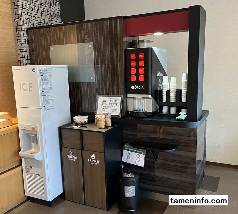 ロビー横にあるのがこちらのフリードリンクコーナー。