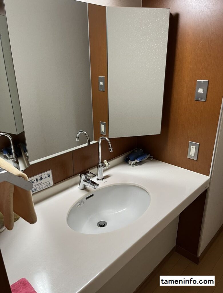 洗面台は広々していて鏡も大きく、2人で使っても窮屈に感じません。